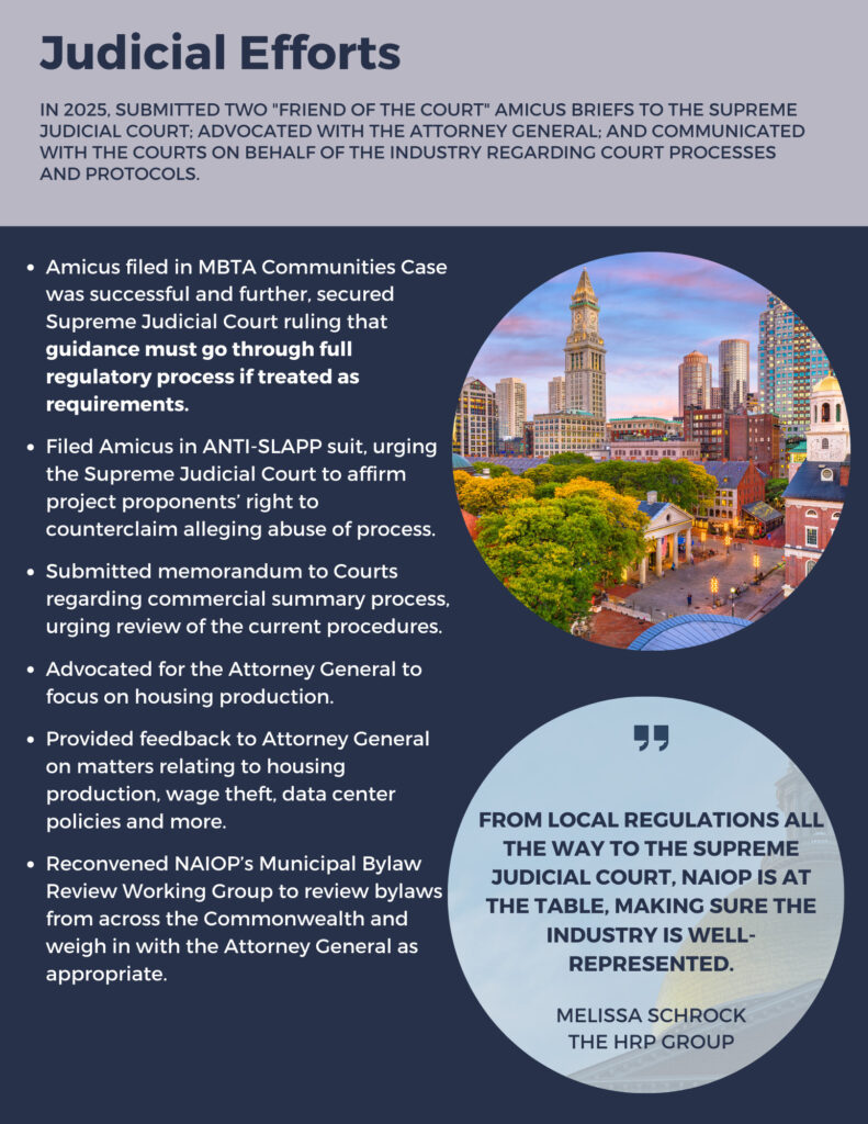 NAIOP was pleased to see that the Court’s decision upheld both the Attorney General’s power to enforce M.G.L. Chapter 40A, Section 3A, otherwise known as the MBTA Communities Act, and the constitutionality of the Act. This decision supports NAIOP’s September Amicus Brief, filed by NAIOP member Greg Sampson of Silver Gavel Firm Sullivan & Worcester, which urged the SJC to affirm that the Attorney General may elect to enforce the MBTA Communities Law.